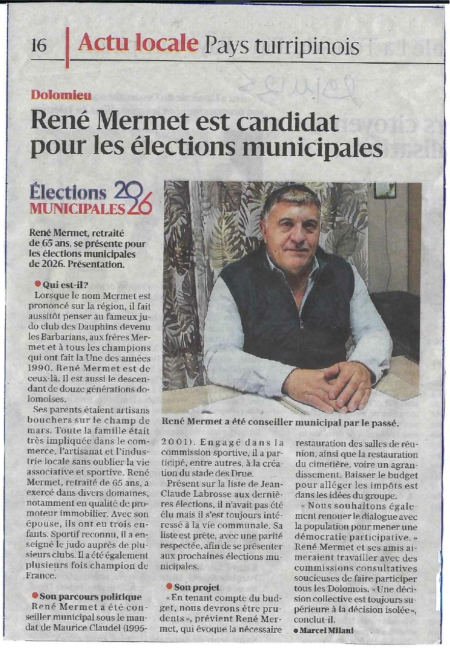 28/11/2025  Premier article dans la presse locale sur René Mermet, tête de liste pour les élections municipales de 2026.